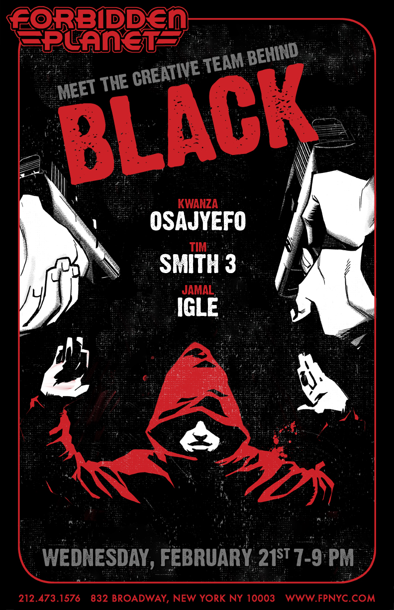 Join us at Forbidden Planet NYC on Wednesday February 21st at 7pm when our guests will be writer Kwanza Osajyefo and artists Tim Smith 3 and Jamal Igle, creators of the acclaimed new comic series Black.