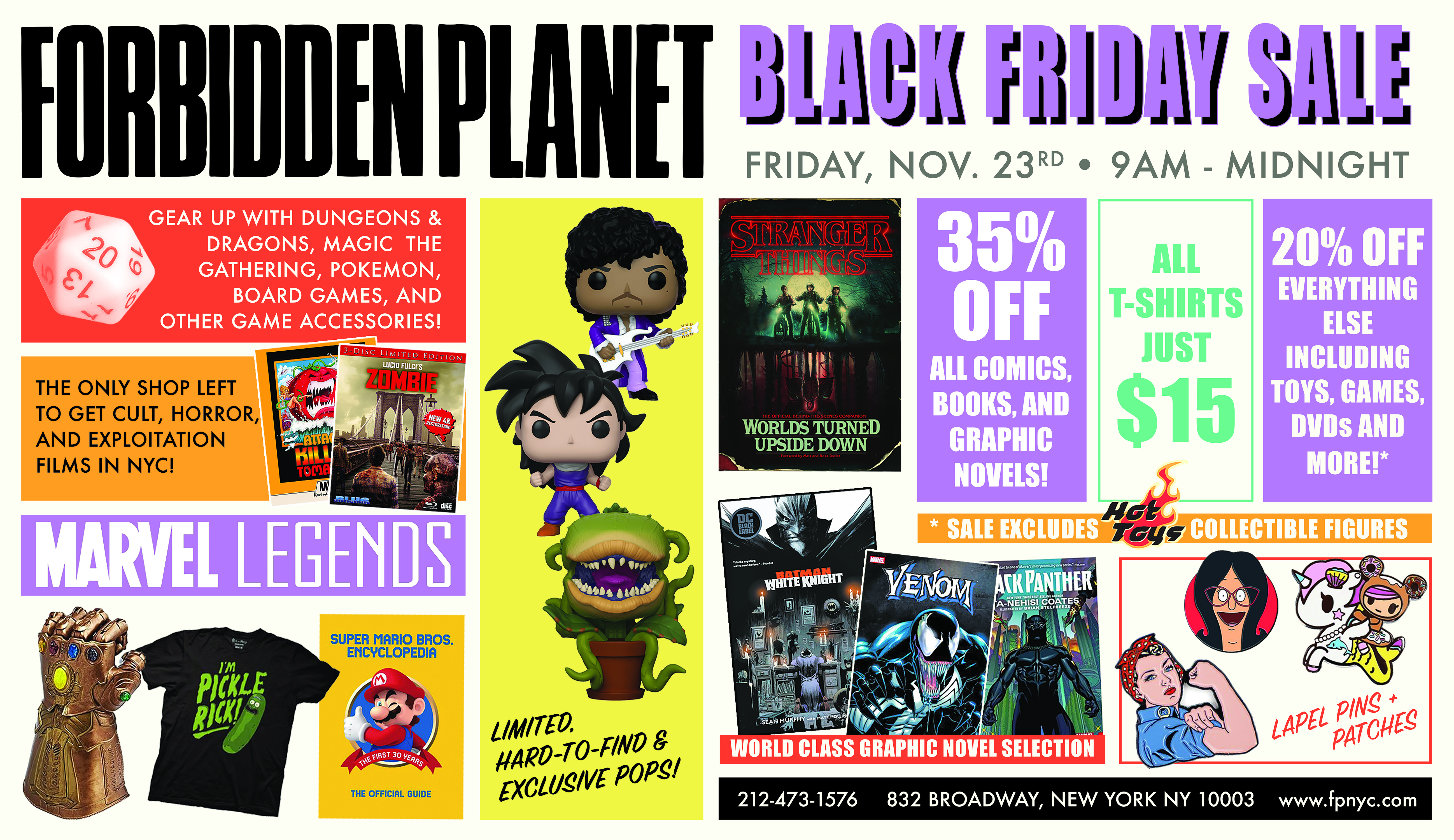 Make Forbidden Planet NYC your Black Friday destination and take advantage of our biggest store-wide sale of the year. This year we’re offering 35% off all comics, books, graphic novels and manga, and 20% OFF nearly everything else in stock.