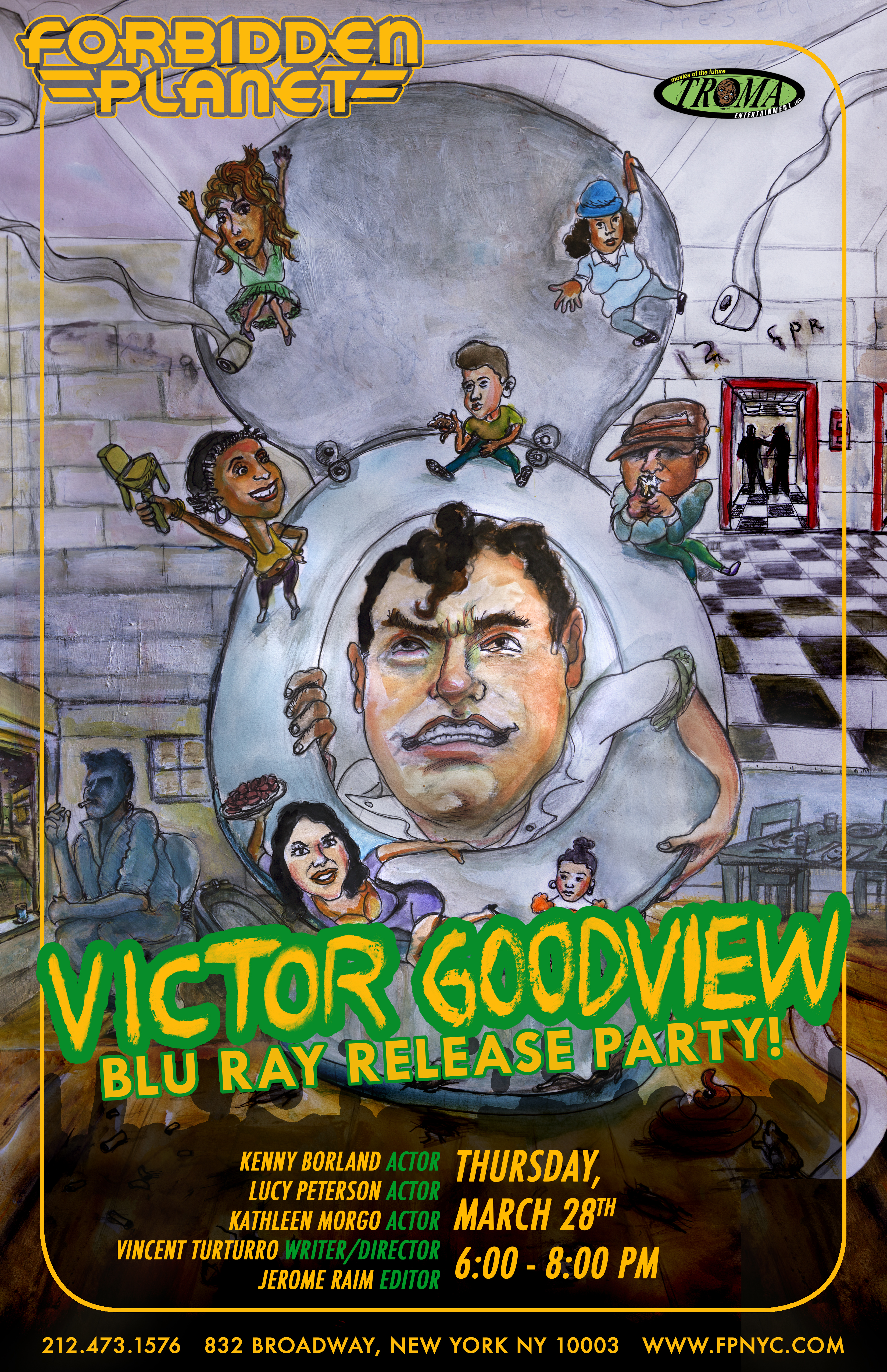 Thursday March 28th 2019 from 6 to 8 PM come down to Forbidden Planet NYC and get weird with the talent behind the film Victor Goodview! This brand new blu ray release from Troma Entertainment, New York City’s oldest running independent film company, will surely be a wild addition to their already insane catalog of films. On hand for this riotous release party will be the masterminds behind Victor Goodview, creators Vincent Turturro (Wirter/Director) and Jerome Raim (Director of Photography/Editor) as well as stars Kenny Borland (Rick), Tammi Cubilette (Geri) and Kathleen Morgo (Deen). So make sure to mark your calendars and make it a point to support independent art!
